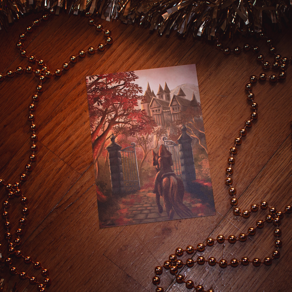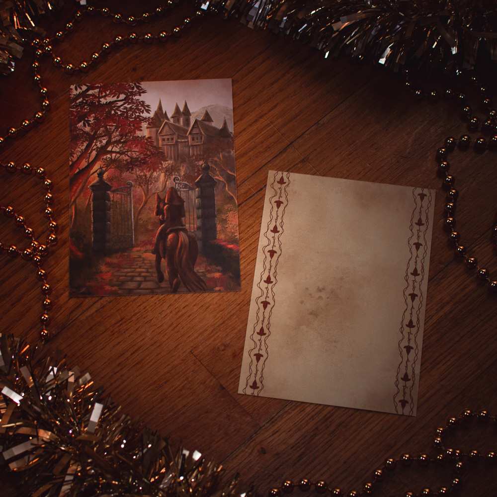 La Route du Château Abandonné – Une carte pour apporter une touche artistique à vos messages et correspondances en tout genre. Cette carte représentant une silhouette de cavalier chevauchant vers un mystérieux château perché, aux couleurs automnales chatoyantes, sera particulièrement idéale pour personnaliser vos lettres de correspondances, pour des cadeaux, remerciements, cartes de vœux, etc.
