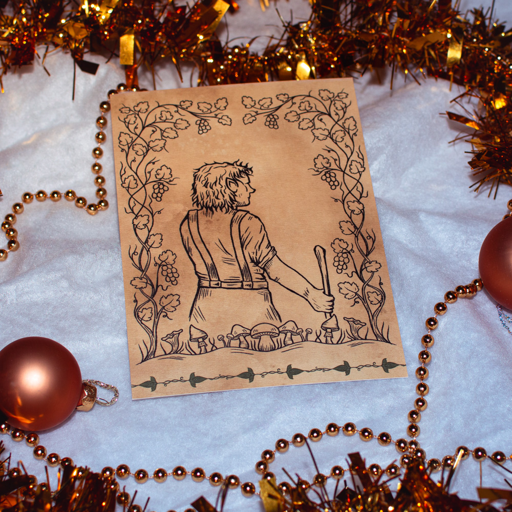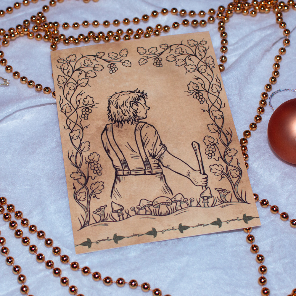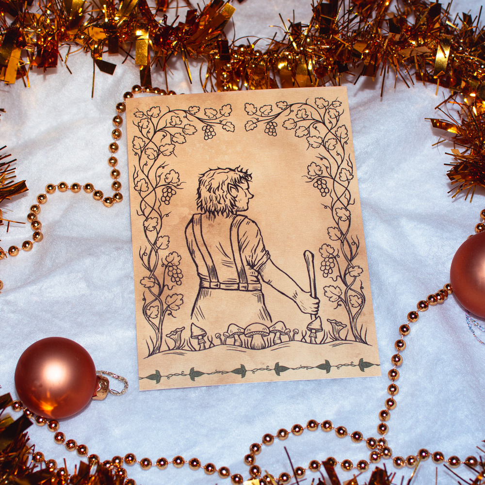 Ce print A5 met en lumière une illustration fantasy chaleureuse et pleine de charme. Elle représente un hobbit au caractère déterminé et courageux, entouré d’un cadre ornemental inspiré de la nature. La partie basse du cadre montre des champignons, clin d’œil à l’amour des hobbits pour les bonnes choses de la terre, tandis que le reste du cadre arbore un motif de vigne et de grappes de raisin, évoquant les festins et la convivialité de leur peuple. Ce cadre délicat apporte une touche gourmande à la composition. Parfait à offrir ou à encadrer, ce print séduira tous les amateurs d’univers fantasy. Il ajoutera ainsi une note artistique unique à leur intérieur.