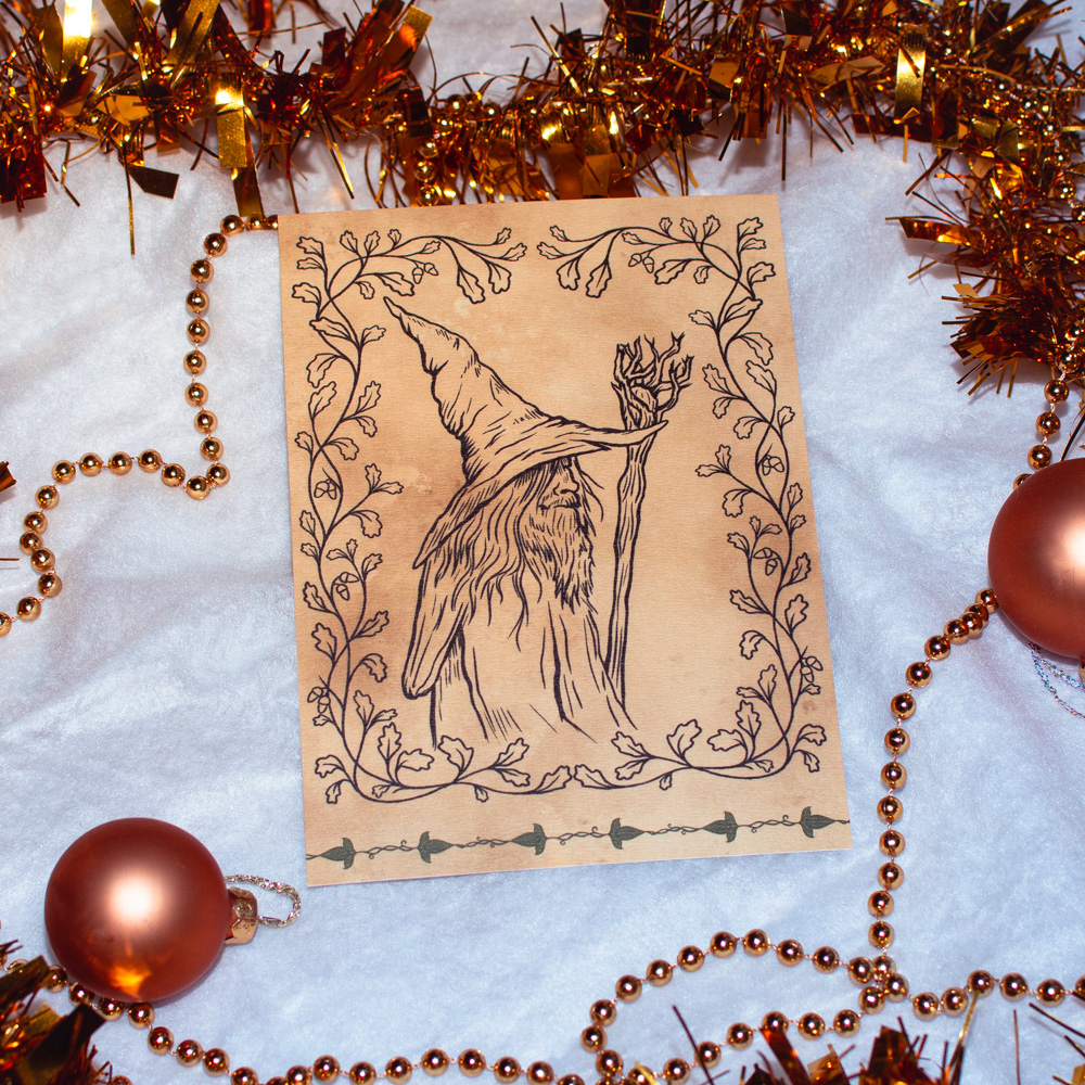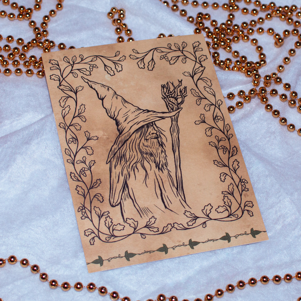 Ce print A5 met en lumière une illustration fantasy captivante. Elle représente un magicien aux traits empreints de sagesse et de mystère, vêtu d’une longue robe et coiffé d’un large chapeau pointu. Un cadre ornemental composé de motifs de branches de chênes, symbole de sa sagesse et sa longévité, vient l’entourer délicatement. Parfait à offrir ou à encadrer, ce print séduira tous les amateurs d’univers fantasy. Il apportera ainsi une touche artistique unique à leur intérieur.